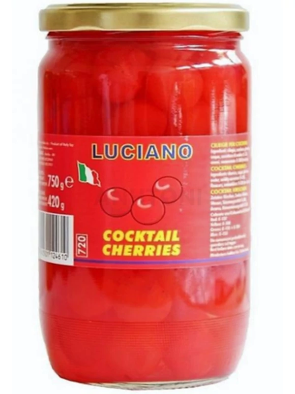 A piros, szár nélküli koktélcseresznye 0,75 kg-os kiszerelésben, koktélok és desszertek díszítésére ideális.