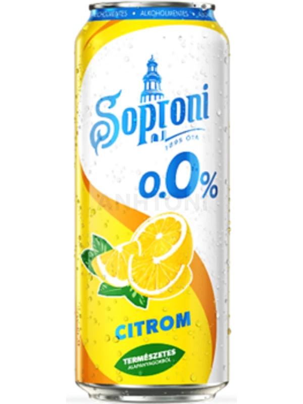 A Soproni 0.0% citromos ízesítésű alkoholmentes sör frissítő, üdítő jellegű ital, 0,5 literes dobozban.