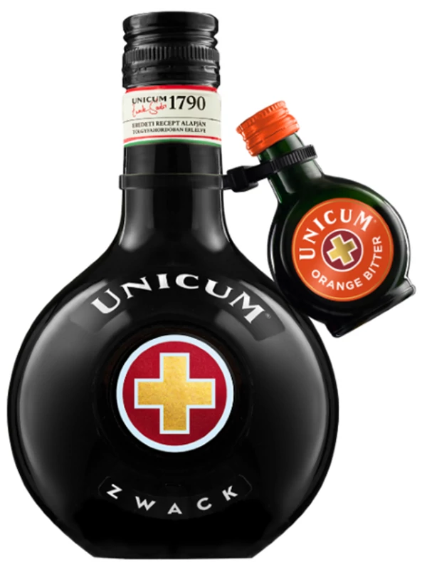 A Zwack Unicum 0,5 literes palackban, 40%-os alkoholtartalommal, Unicum Orange mintával kiegészítve.
